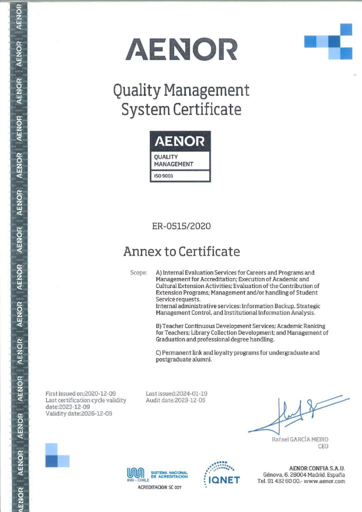 En sesión ordinaria de 2 de abril de 2025, Acuerdo N°056/2025 y de acuerdo a la Resolución Exenta N°110 del 15 de abril de 2025, el Consejo Nacional de Educación aumenta a un período de cinco años, la acreditación “Avanzada” para nuestra Casa de Estudios Superiores, en las áreas de Gestión Institucional, Docencia de Pregrado y Vinculación con el Medio.